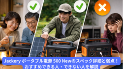 中容量(500Wh~999Wh) Jackery ポータブル電源 500 Newのスペック詳細と弱点!おすすめできる人・できない人を解説 この記事では、Jackery ポータブル電源 500 Newのスペック詳細や特徴、どんな人におすすめできるのかを分かりやすく解説します。結論からお伝えすると、Jackery ポータブル電源 500 Newは、軽さ・充電スピード・安心感を重視する人にとって、非常にバランスの取れたモデルです。 2026.02.04 中容量(500Wh~999Wh)